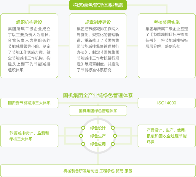 國機(jī)集團(tuán)堅持綠色、低碳發(fā)展理念,以節(jié)能環(huán)保關(guān)鍵技術(shù)和產(chǎn)品研發(fā)為支撐,以節(jié)能環(huán)保工程集成服務(wù)為主線,加快構(gòu)建資源節(jié)約、環(huán)境友好的生產(chǎn)方式和運(yùn)營模式,在實(shí)現(xiàn)自身低碳運(yùn)營的同時,大力推動綠色行業(yè)標(biāo)準(zhǔn)制定,促進(jìn)機(jī)械制造業(yè)的環(huán)保低碳發(fā)展,為建設(shè)“美麗中國”貢獻(xiàn)力量。